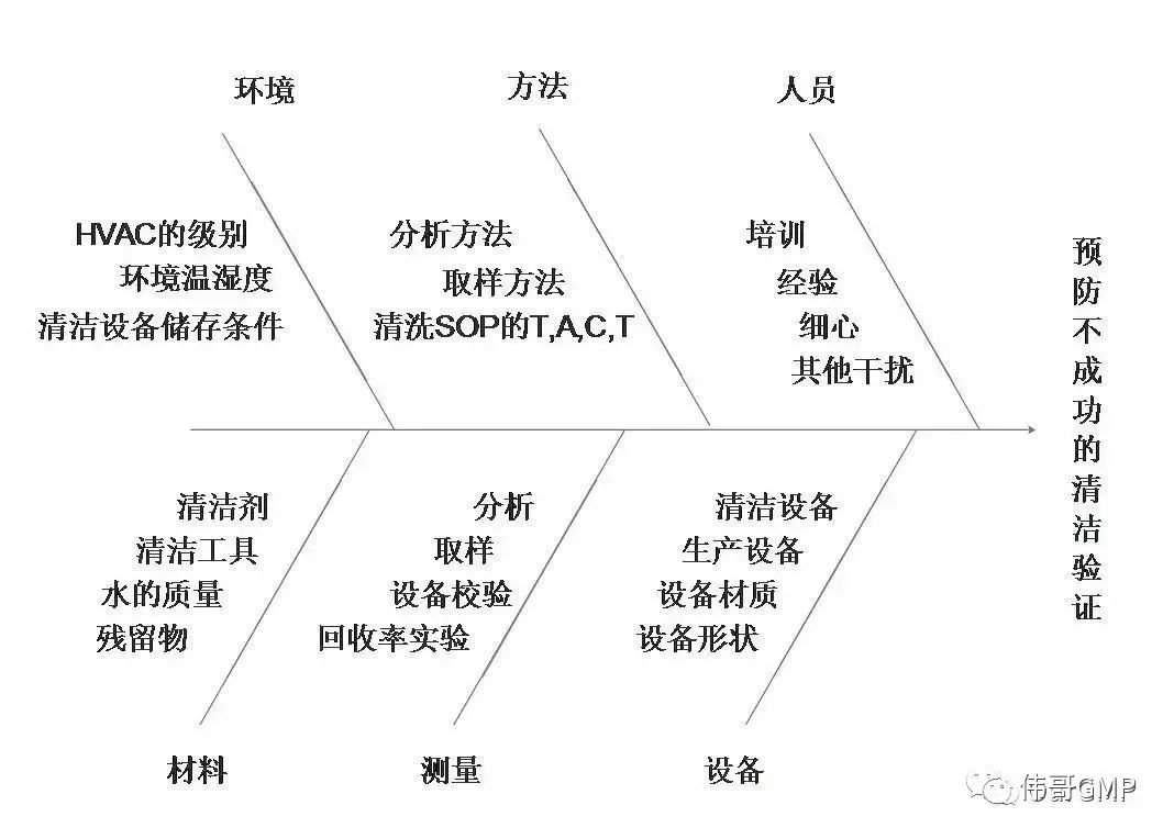 清洁和清洁验证可以从相关的工艺系统知识,污染物和设备清洁辅助系统中进行风险评估、确认。这些系统要进行设计审核,然后根据相关的可接受标准确认,证明已经达到系统的相关要求。在清洁验证执行的过程中,有很多影响清洁验证不成功的因素,每个因素都存在着不同的潜在的风险,必须对每个因素进行充分的分析、评估,确保清洁验证顺利地进行,下图用鱼骨图分析确认所有的影响因素。