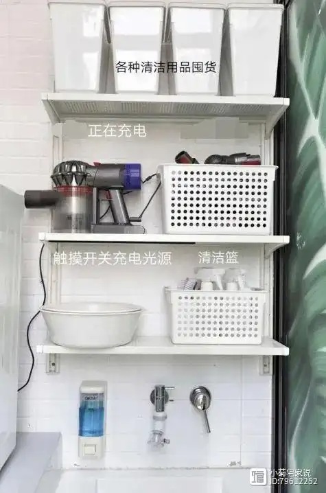 洗手台上面的空间被用来存放各种清洁用品和工具,真是太巧妙了!这样一来,清洁用品和工具都近在手边,随时取用,不用再到处找,洗衣房看起来也更整洁美观。