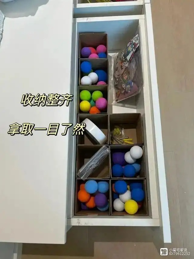 硬纸盒子还可以被用来整理抽屉里的各种小零碎物品。在家庭生活中,常常会遇到一些小零碎物品无处安放的情况,比如钉子、螺丝钉、胶带等。
