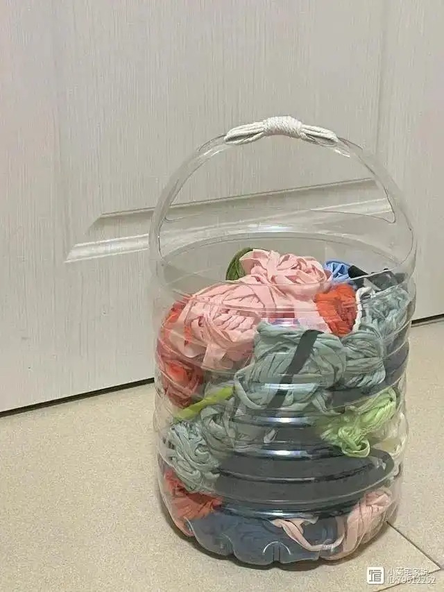 塑料瓶子可以被改造成各种形式的收纳容器。比如,用来装毛线的收纳桶、用来做小垃圾桶的塑料瓶,都是她们的杰作。你看,一桶放在那,不仅整齐,而且还方便拿来用,不得不佩服她们的聪明才智!