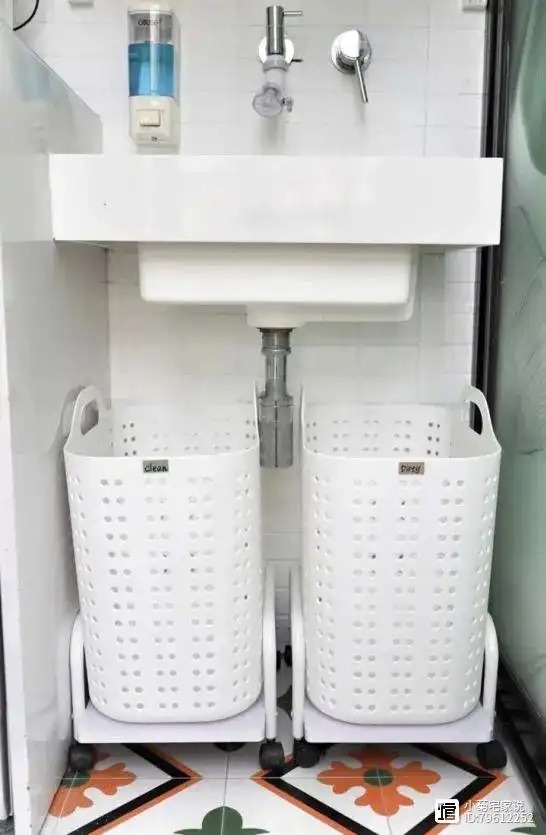 他们把洗手台下面的空间利用起来,放了个脏衣篓,又美观又实用!这样一来,脏衣篓就放在洗手台下面,不仅不会占用其他地方,而且还可以直接把脏衣服扔进篓子里,整理和收纳都省了不少事儿。