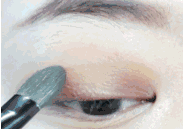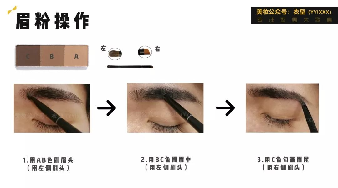然后眉毛较稀疏,有空缺的朋友,再用眉粉补个色,以三色眉粉为例,具体步骤如下图