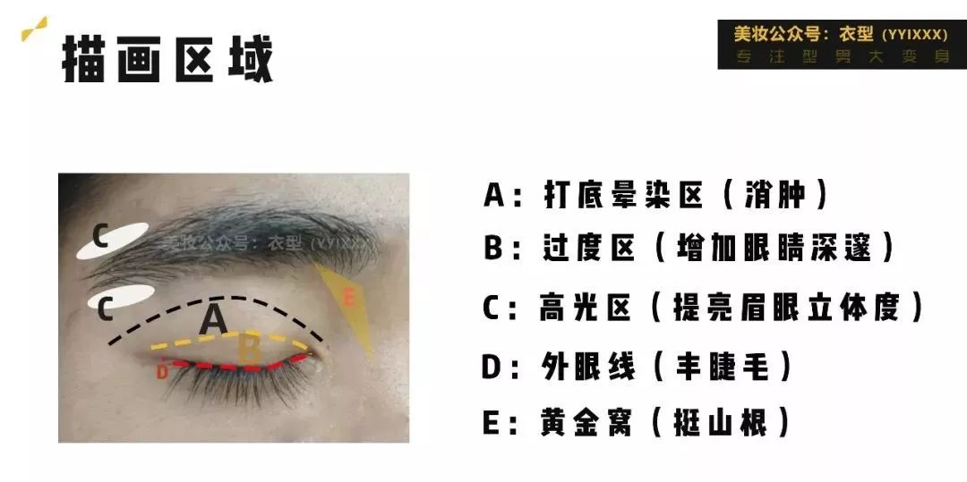 ②大眼妆:A区用打底色晕染,B区用过渡色晕染,D线用阴影色画一条细线,C区用高光色提亮,E区用打底色晕染