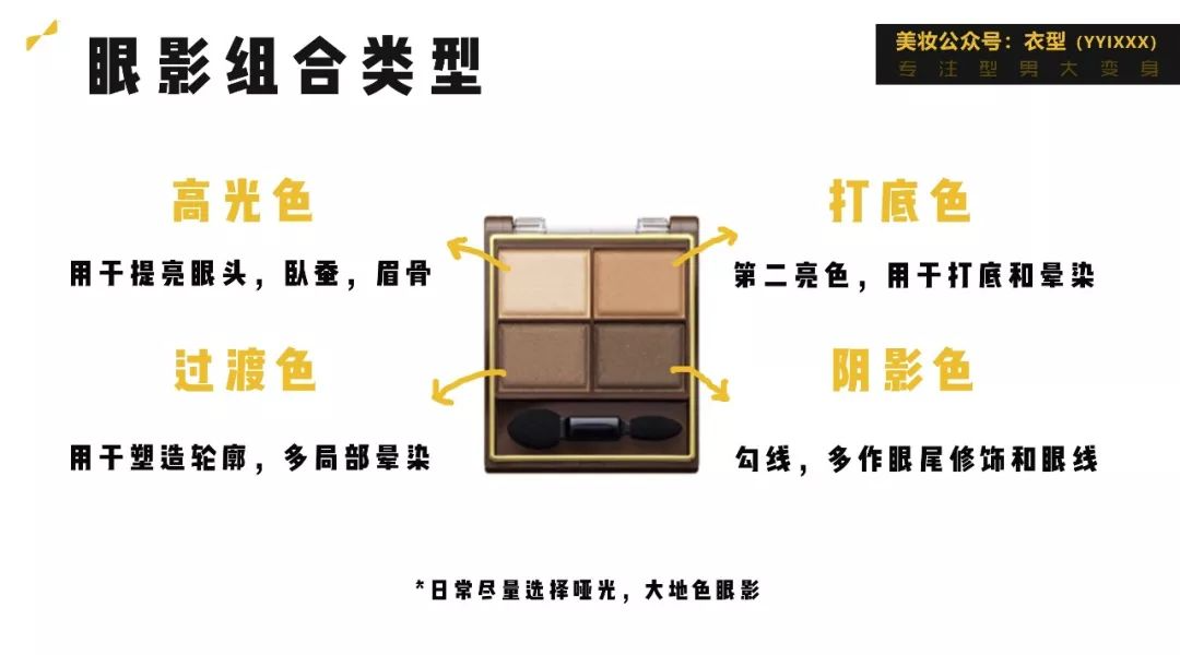 男生大多不需要眼妆,顶多一盘大地色哑光眼影,可以消肿显眼大!下面就拿最常见的大地色四色眼影来给大家展示下每个颜色的用处。