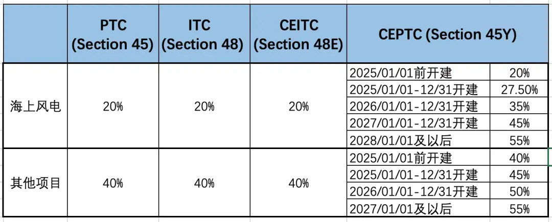 IRA规定,2024年12月31日后投入运营的清洁电力项目只能申请CEITC和CEPTC。CEITC和CEPTC 鼓励创新,属于技术中立。只要是零碳电力就能享受税收补贴,因此所支持的零碳技术范围比ITC和PTC广。