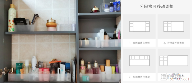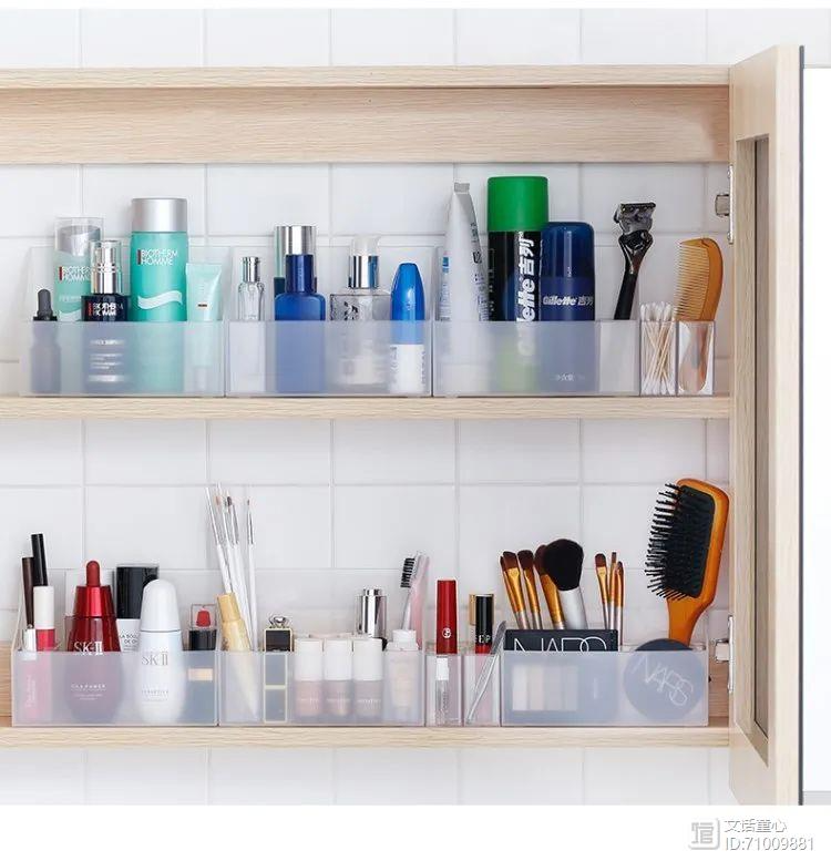 家里浴室有镜柜的话,强烈推荐这款收纳盒。其深度和镜柜完美匹配,可以充分利用镜柜的深度,而不用担心物品掉落。另外还配有两个小的分隔盒,可以任意组合,放口红眉笔粉刷都很方便。半透明的设计深得我心,既一目了然又干净清爽。