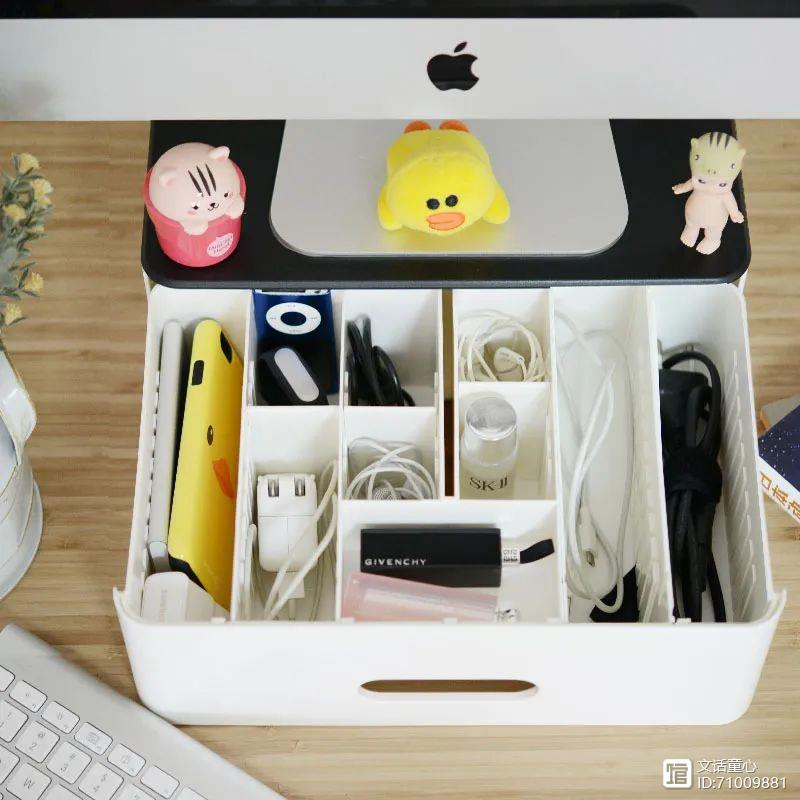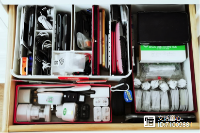 相比数据线收纳包,我更喜欢这种盒子的设计。收纳包往往由于分隔太窄,放取数据线有点费劲。这种盒子的设计,可以在一定范围内自由分隔,而且容量更大。下图中左上的盒子就是这款数据线收纳盒,窄条的设计特别能装,我装了N台旧手机,移动硬盘和N根数据线。我的收纳秘诀是,能立着的绝对不躺着,所以包括数据线在内,我也是让它们立着的,这样打开抽屉之后,可以快速锁定并拿取。