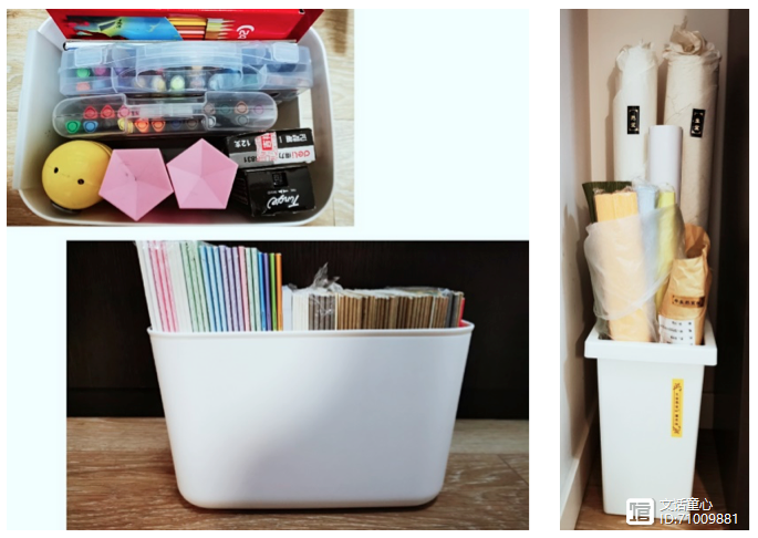 在这里顺便分享一下宣纸和手工皱纹纸等细长条纸卷的收纳方式,我用了宜家的一款窄型垃圾桶,放在缝隙里,物美价廉又美观。