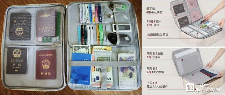 购买时注意尺寸。我买的是大号的,可以将家里所有证件全部收纳进去,非常适合强迫症,而且方便查找。遗憾的是,这类收纳包通常都没有“照骗”那么硬挺,需要装满才会比较方正,否则软塌塌的。另外,我对银行卡位不太满意,由于材质和设计原因,银行卡很容易滑落。所以大部分卡片我是放在专门的卡片包,再放到这个证件包的底层。还有,U盾分隔位也比较鸡肋,只适合放长条形的U盘。放U盾的话,一是数据线很难塞进去,二是有些银行的U盾根本塞不进去。