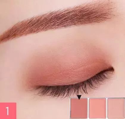 Step 1:用偏棕色的珊瑚色眼影在上眼皮晕染,将眼影从眼睑往眼窝深处晕染开。