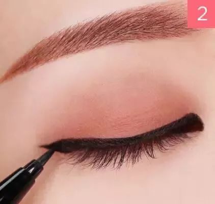 Step 2:用黑色眼线液笔沿着睫毛根部画一条眼线,眼尾拉长上扬。