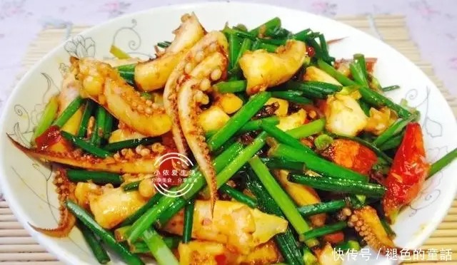 食材:鱿鱼丝350g、蒜苔150g、蒜末适量、姜末适量、郫县豆瓣酱小量、生粉小量、生抽小量、盐、食用油