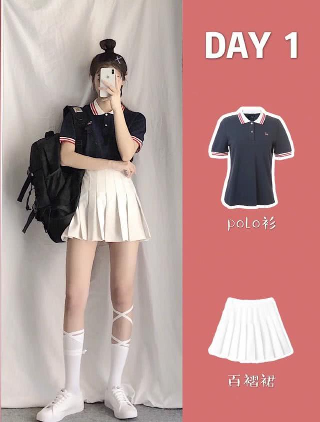 上图:这组搭配就是校园风满屏,POLO衫+百褶裙的少女感很有学生党的减龄效果,再搭配一双小白鞋和充满酷感的学生背包,就能凹出个性十足的日常休闲穿搭,给人一种秒回校园时代的感觉。