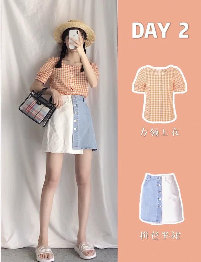 上图:轻复古的橘色格纹上衣穿上身有衬肤白的穿着效果,而方领设计还可以显脸小,搭配一件拼色的时尚牛仔裙,简约大方又不失时尚,而一双小凉拖恰恰可凹出休闲惬意的造型,年轻又清爽。