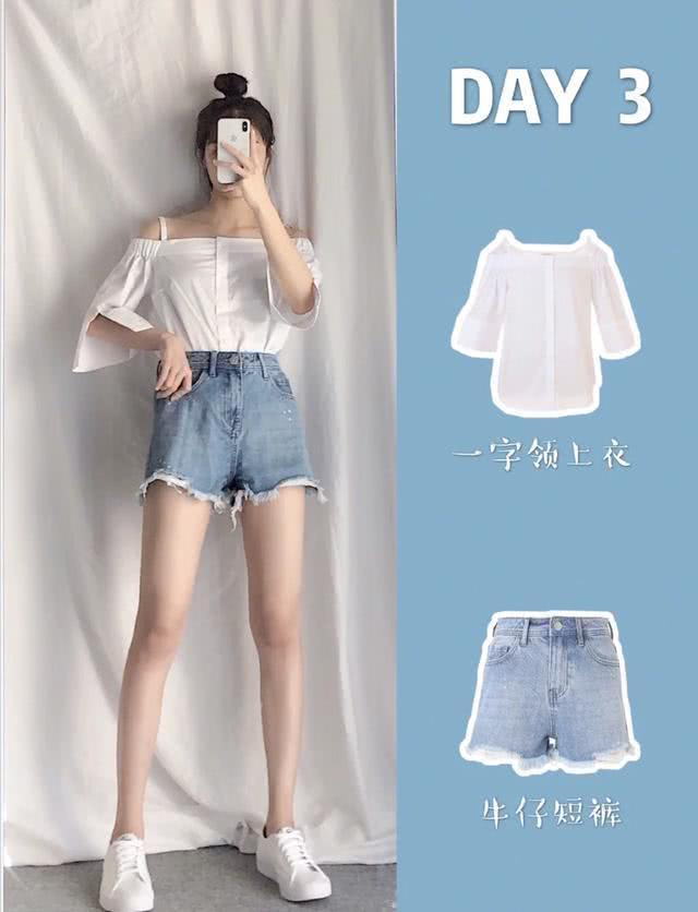 上图:蓝白配,清新又减龄,而一字肩设计的上衣还可以小小地秀性感,展现你的优美锁骨,再搭配可以秀大长腿的牛仔短裤,凹出个性十足的微性感造型。出门前扎个丸子头,可盐可甜又减龄。