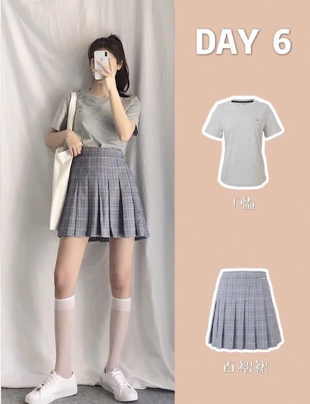 上图:很有学院风的T恤+百褶裙搭配,选择了全身灰色系的搭配法,看起来会更有高级感,而且搭配的帆布包和帆布鞋都是相衬的白色,可以中和掉灰色的沉稳感,给造型带来几分清爽干净的青春气息。