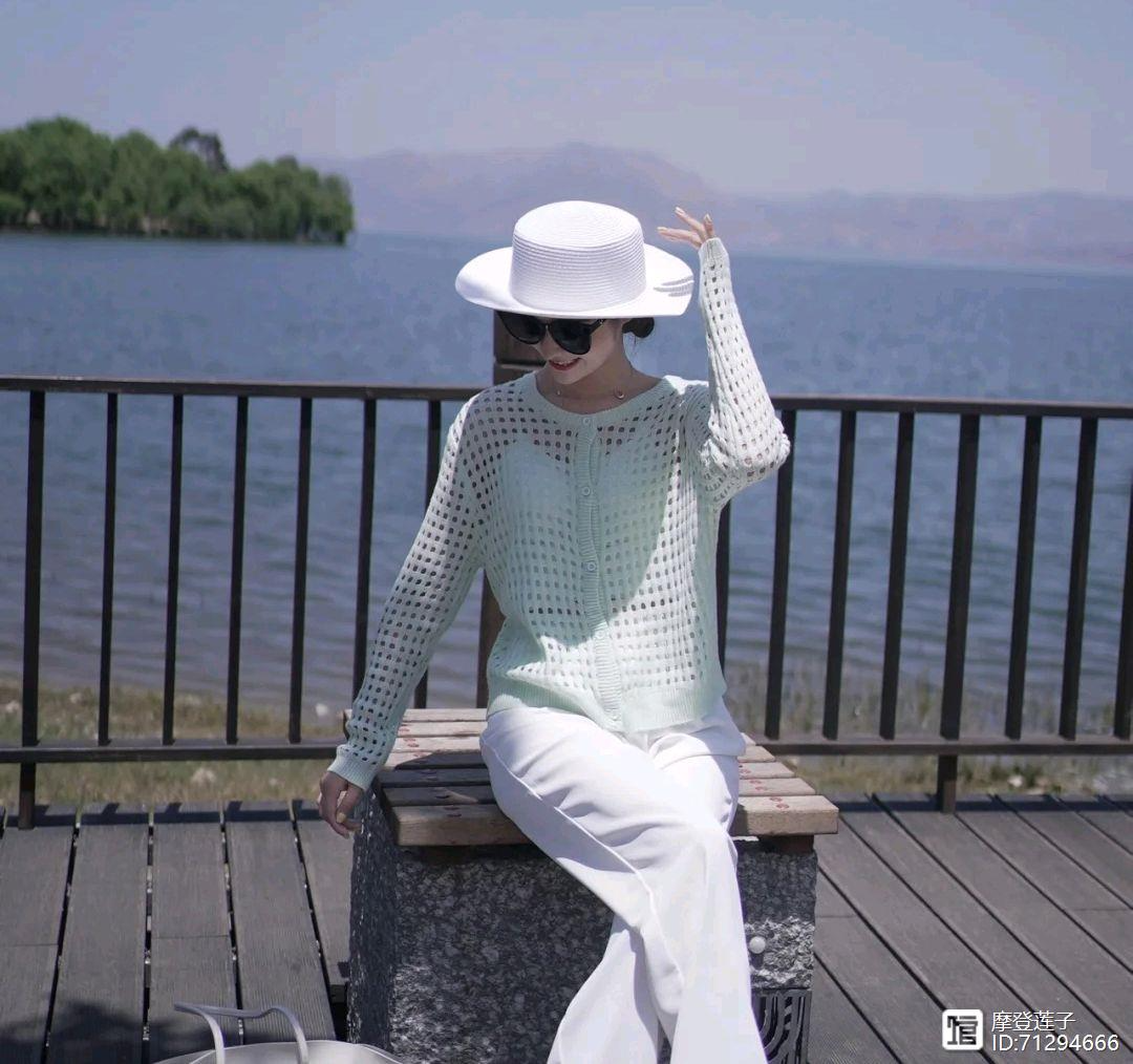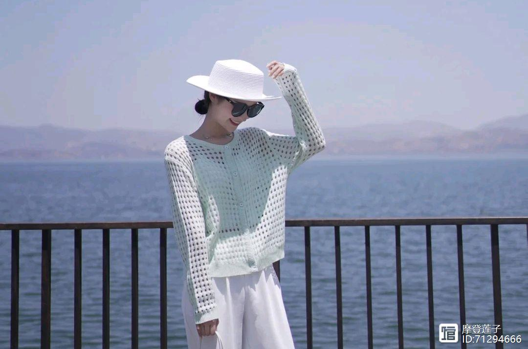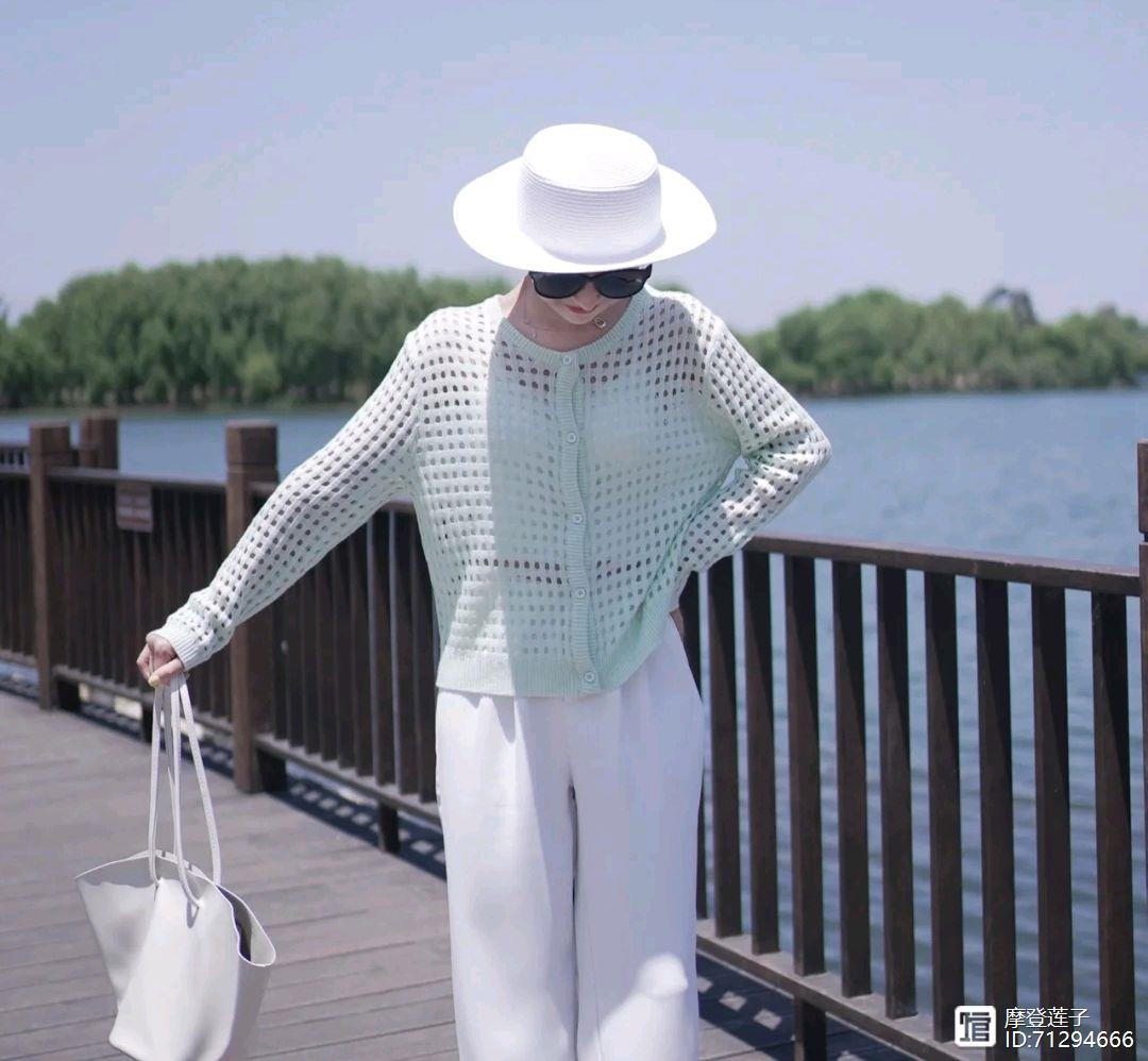 就像这位时尚博主的这身穿搭就很适合作为日常穿搭,她选择了颜色偏浅的蓝色镂空针织衫搭配白色休闲裤,穿出了温柔又精致的感觉,还穿出了一丝丝慵懒的味道。