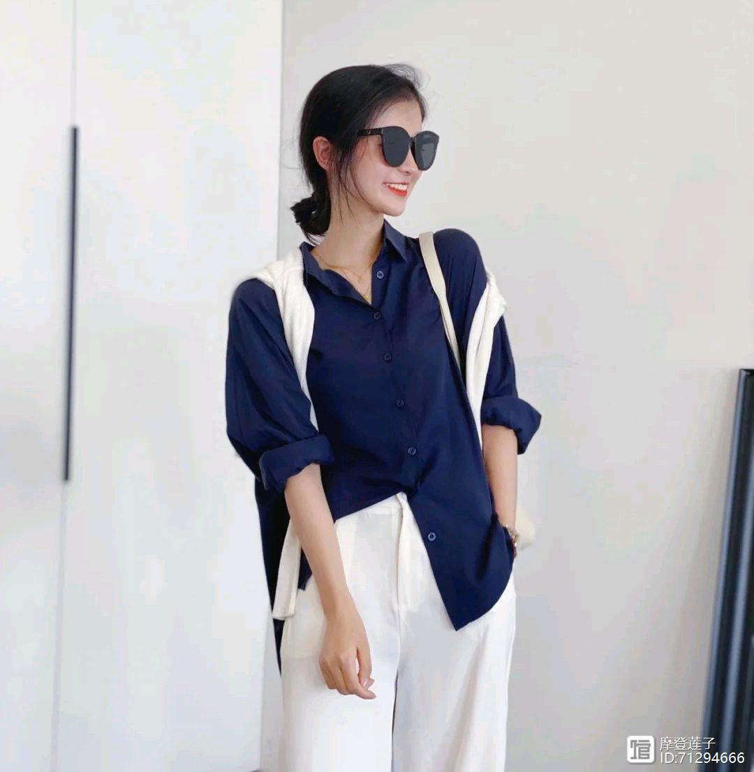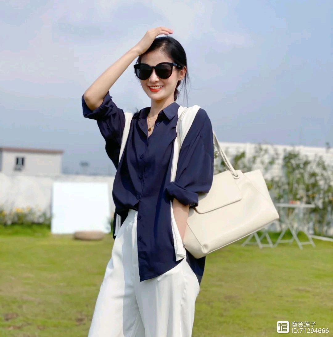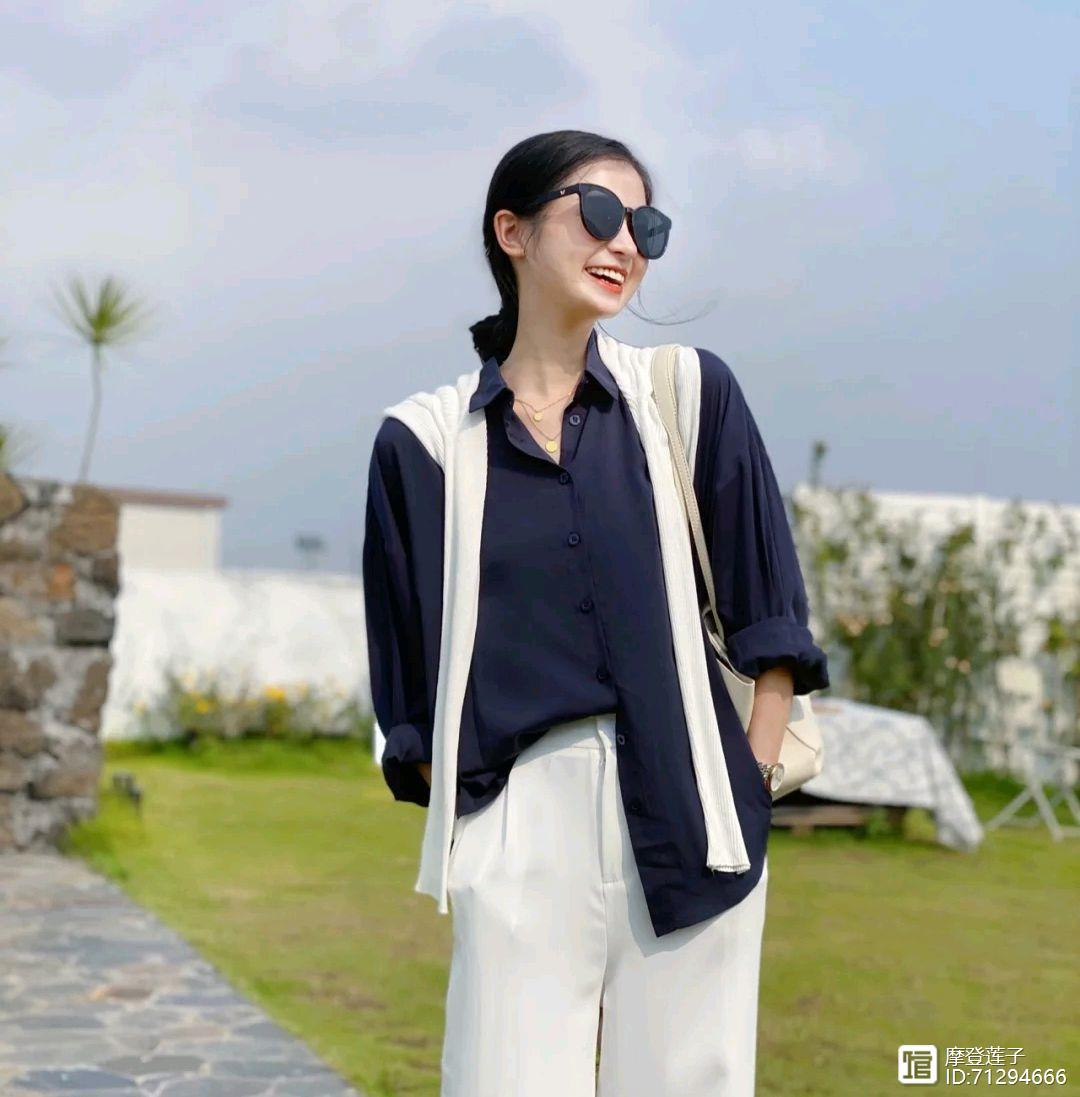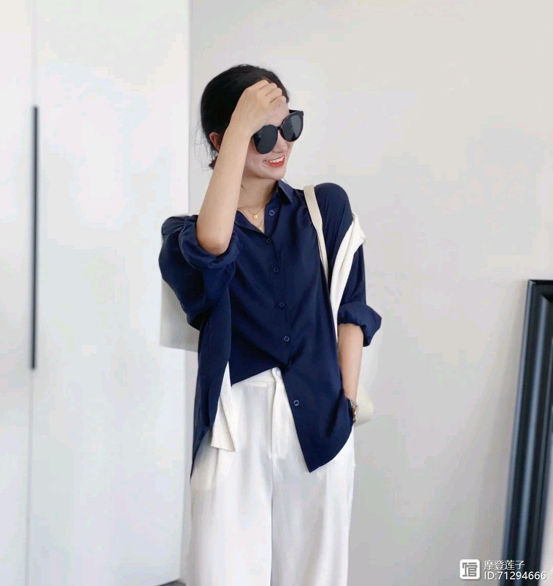 就像这位时尚博主一样,选择藏青色衬衫搭配白色休闲裤,虽然很简约却意外的高级,有种简约中透露着精致的美感,当然这很考验个人的穿搭技巧。
