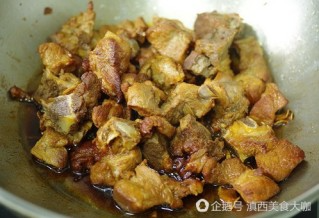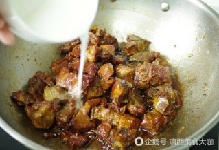 8、 继续煸炒,加入水,烧开后盖盖转小火焖20分钟