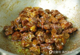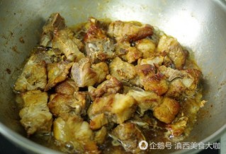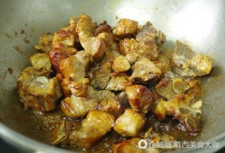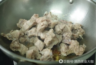 6 、放入排骨,煸炒