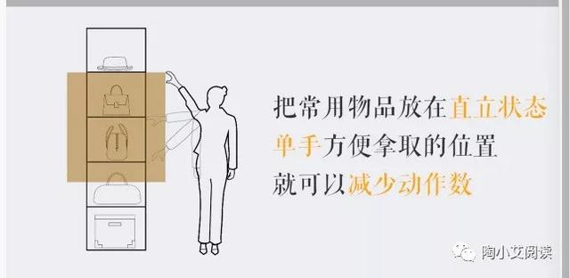 把常用物品放在我们人体直立状态单手方便拿取的位置,就可以减少动作数。