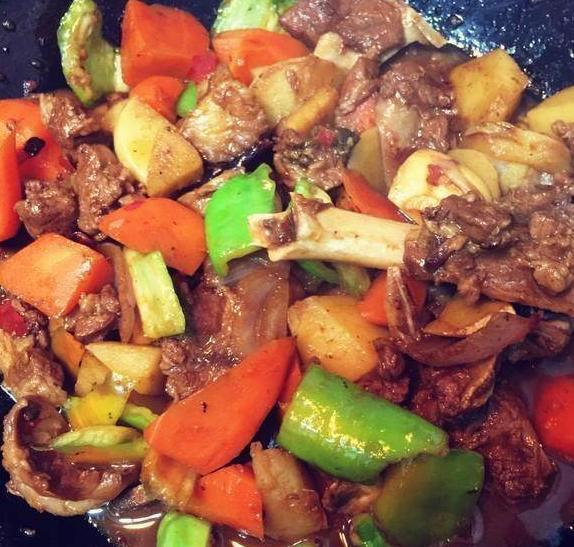 酱焖羊肉,做法:1.羊肉放入清水中清洗至无血水后捞出,锅内放入适量的冷水,下入羊肉,加入两小勺醋,烧开后用漏勺将其捞出,再用清水冲去血沫,沥干待用;2.八角、桂皮、香叶、草果、干辣椒洗净,胡萝卜洗净后切成滚刀块,待用;3.起油锅,先下入八角与桂皮,炸出香味后下入羊肉,(此时另烧一锅热水),将羊肉表面的水分炒干后下入两小勺料酒,炒匀;再下入黄豆酱(我放了图中的勺子三大勺),炒匀;4.放入草果、