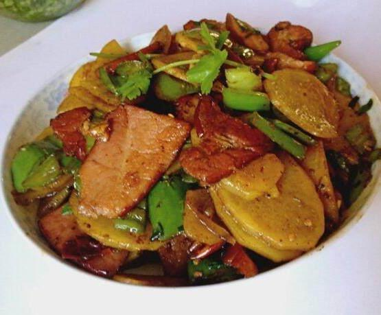 腊肉土豆片,做法1.腊肉蒸熟,切薄皮。土豆去皮切片凉水浸泡一下;2.锅里热油,放葱姜炝锅,倒入腊肉土豆翻炒,加老抽上色,可加少许水,翻炒10分钟3至土豆熟,加青椒翻炒均匀;3.出锅后加青蒜调味。(爱吃辣椒者可加干红辣椒炝锅,味道更香。腊肉本身有咸味,老抽与盐适量。)