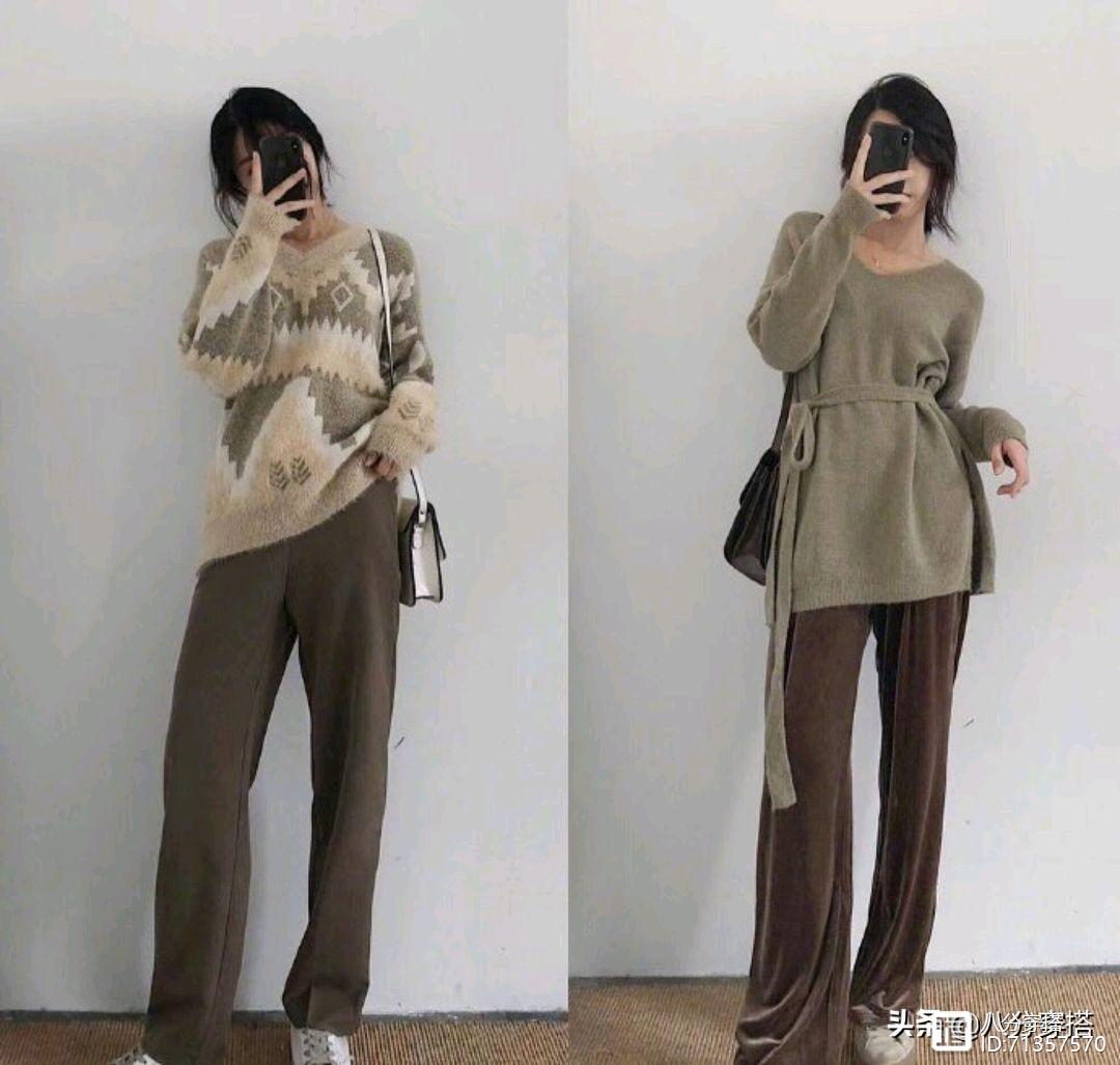 针织衫是秋冬季节大家人手一件的时尚单品,天气不算特别冷的时候,宽松舒适的针织衫之间单穿更加细腻温柔,一件V领的不规则花纹针织衫,复古洋气,柔软舒适,搭配上阔腿裤休闲随性,想要更有个性的话,可以借鉴旁边的造型,针织衫搭配腰带勾勒腰线,整体造型更加个性,看头十足,但是又不至于浮夸,作为日常穿搭很有魅力。
