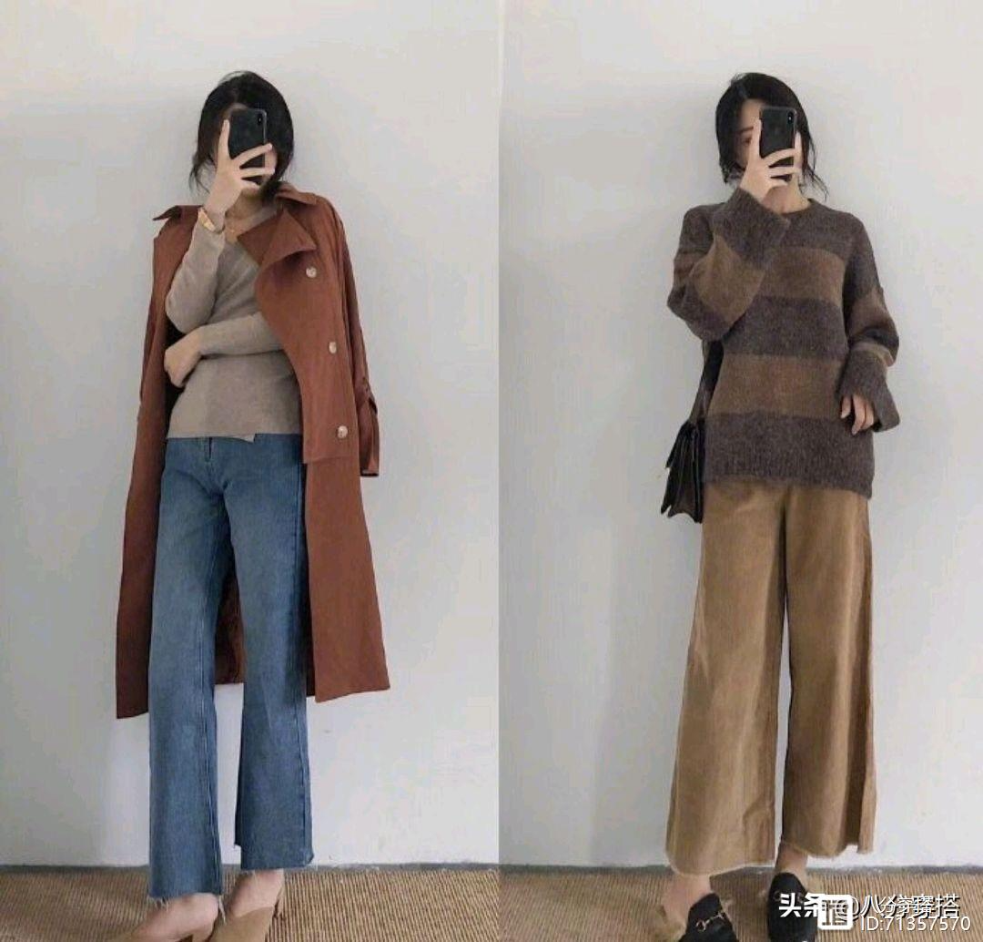 在颜色的选择方面,同色系穿搭或者是撞色是最常见的方式了,撞色更有冲击力,不过想要效果更加柔和一些的话,选带有一定灰度的颜色更好,燕麦色内搭搭配上一件红棕色的大衣,温暖简约,洋气精致。同色系穿搭有视觉顺延感,更加协调自然,一件条纹的棕色上衣搭配浅棕色的阔腿裤,温暖厚重,舒适简约,不过皮肤不够白皙的女生就不建议穿搭这样的颜色了,太暗沉了,衬托得人一点气色都没有。
