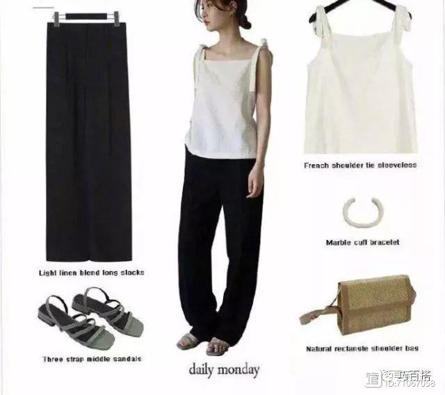 ▲这一套的搭配想必是最基础不过的款式了,白色系和黑色系的配色也是非常的基础的。所以说这套搭配非常的容易驾驭,如果你的手臂肉肉不要比较多,那么也不要怕。可以将上衣换成T恤或者是搭配款防晒衫,这样既可以防晒,又可以起到遮肉显瘦的效果。