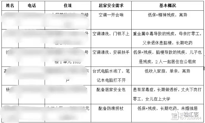 通过入户的形式,对低保救助对象的居住环境进行安全评估,并将个性化的需求做记录整理。前期走访共41户, 最终筛选出有需求的服务对象20户。