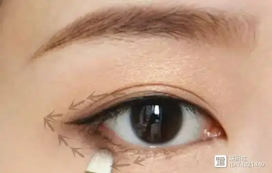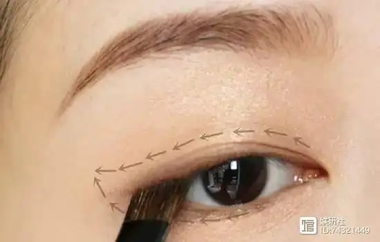 当眼窝上的浅棕色涂抹好之后,再选择一款深棕色或者灰色的眼影,沿着睫毛根部的周围,把整个眼型都包裹着涂一遍,范围不要太大,只要控制在双眼皮褶皱附近就可以了,最后再眼尾处加粗,打造眼尾上扬的妩媚感。