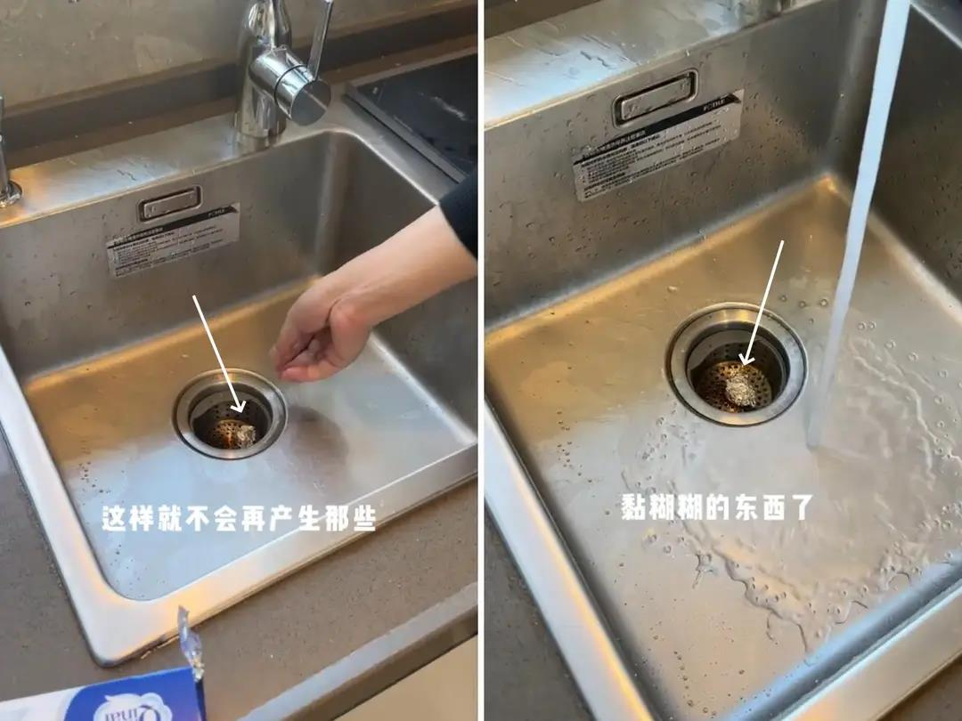 在书房水槽的漏斗里,放一小坨用锡纸揉成的球,能有效防止排污口处产生黏糊糊的污垢。因为锡纸表面比较光滑,污垢不容易附着在上面。而且,锡纸还能用来磨剪刀,用剪刀剪一剪锡纸,大概剪 10 下左右,剪刀就能变得更锋利。小吴在水槽漏斗里放了锡纸球,一段时间后发现水槽排污口果然干净了很多,没有了之前那种黏糊糊的污垢。