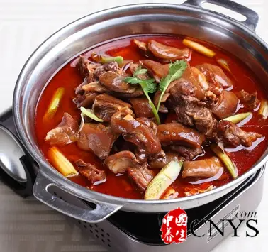 3、炒锅置火上,下油加热,放姜、蒜、葱炒香,掺白汤,放羊肉、味精、鸡精、胡椒粉、料酒、当归烧沸,放盐,除尽浮沫,倒入高压锅,压10分钟后起锅入盆,上台即可。