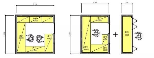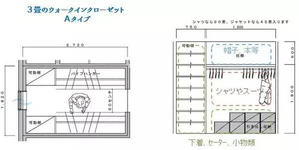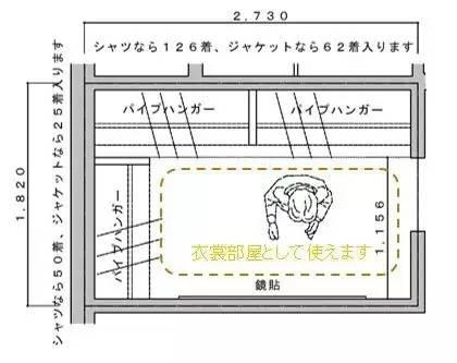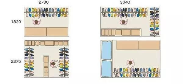 上图左图一个纯粹作为收纳空间的衣帽间的布局,面积大约为7.5平米。考虑布置衣橱(进深600mm)和普通收藏柜(进深450mm),收藏部分的面积比例大约为52%。