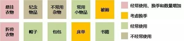 除了考虑整体空间的利用,通过考虑使用上的细节来决定空间的划分也是一件非常有意思的事情。用一个约1900×2600的步入式衣帽间的例子来说明:首先我们需要考虑的是,我们在衣帽间里存放什么?对于需要收纳的物品整理并且如下,并考虑是否需要换季存取、是否经常性使用以及是否经常性增加数量来进行分类。