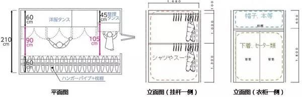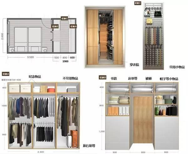①折叠衣物堆在一起难以取出②悬挂的衣物挤得很严重③悬挂衣物的长度不一导致下部的空间很难利用④没有地方放包包(这个问题不只是女士专有,男士的办公休闲体育用的包包的存放也经常很令人困扰)⑤因为下方设置了别的柜子导致衣服下摆变形严重⑥衣柜里除了衣物还塞了一堆杂物难以清理⑦换下的睡衣等等因为没有地方放就随手扔在床上,导致房间显得凌乱在日本很常见的衣柜的做法是,整个衣柜中只有一根晾衣杆和一块上部的置物板,下方通常是用户自己设置小的收纳抽屉或者收纳柜,自由性很强但是规划不足。国内的衣柜通常以隔板为主,空间划分的比较详细,但是也往往使得使用者难以自由规划收纳的空间。因此,在衣柜的设计中,往往需要兼顾两者,既能够划分清楚收纳物品的空间关系,又能够留出一定的自由设置的余地,满足不同用户的使用需求。