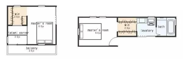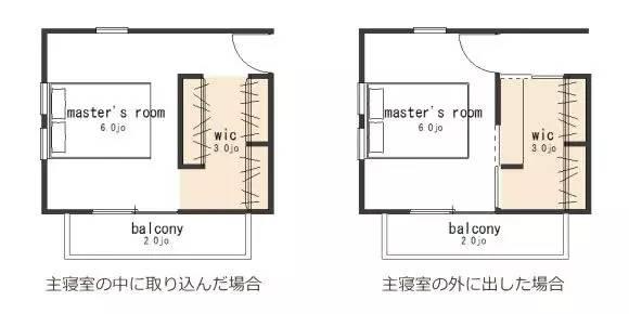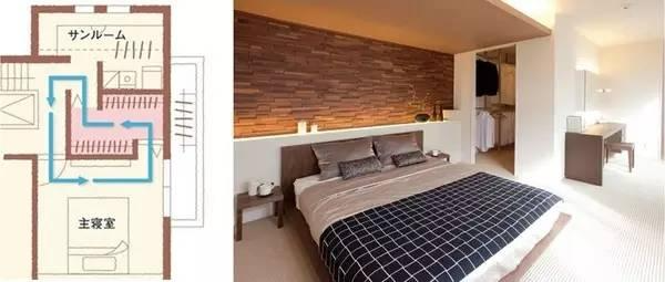 按照这种逻辑可以衍生出新的布局方式和使用模式来。例如用衣帽间连接卧室和榻榻米(和室,常常作为茶室使用),是日本常用的方式。因为两个房间都需要大量的储藏空间,共用衣帽间能够提高收纳效率,并且在卧室和和室之间形成了一个过渡空间,造成藕断丝连的空间感受(下图左)。或者用衣帽间连接浴室和卧室,从而形成主卧—取衣物—浴室的豪华流线(下图右)。但是需要谨慎处理浴室的干燥和整体户型的布局两个问题,避免“因小失大”。