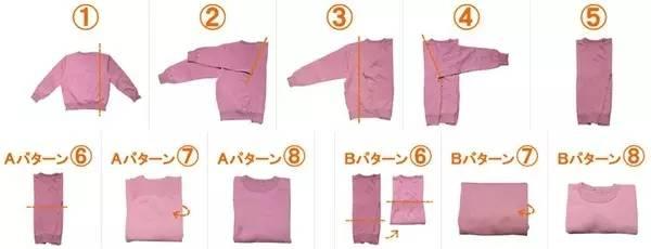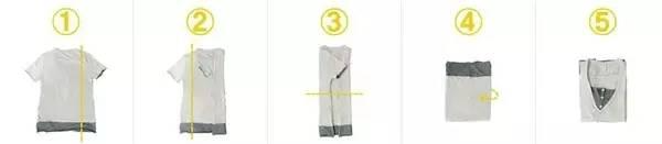 3)更有效折叠衣物的方式对于不常用的衣物以及内衣物品,尽可能节约空间的折叠起来整理到下方的抽屉中。虽然和设计无关,但是为了便于查找还是顺便把各种衣物的折叠方式也整理一下吧!● 短袖T恤:背面按照虚线折叠两侧→折叠下部→完成!