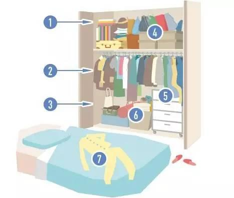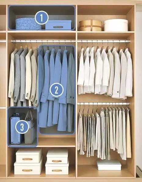 2)给小物品腾出空间如图,根据衣物的长度进行归类,留出一部分空间给卧室的其他杂物,如手提包等。图中的案例中包括:①上部通常难以够着的空间中设置换季的物品收纳箱②根据悬挂衣物的长度给衣物归类③衣柜中给上班上学常用的手提包等留出位置