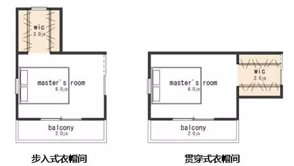 ● 从“步入式”衣帽间到“贯穿式”衣帽间简单说“步入式衣橱”是进入一个收纳的空间进行收纳和整理,而“贯穿式衣帽间”则能够让人在穿过这个空间的过程中进行收纳和整理,因此没有了衣帽间“深处”够不着的问题。如下图左就是一个“步入式”的空间,而右图则是将其作为进入卧室的前室来处理,两者的差别就在于是否贯穿。早晨起床后能够在穿过衣帽间的过程中拿取衣物,相对第一种模式来说能够大大缩短早上找衣服的时间。但是这种贯穿的模式需要增加衣帽间的通道。