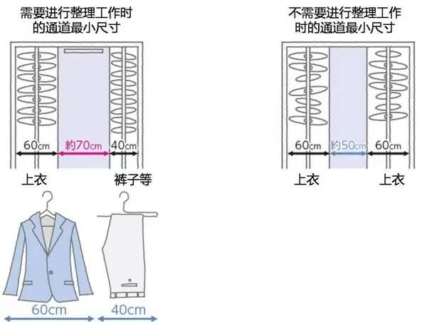 如果内部需要一侧设置挂杆一侧设置带门的衣柜的话,则通道的宽度最好能够增加到900mm,便于打开衣柜门。