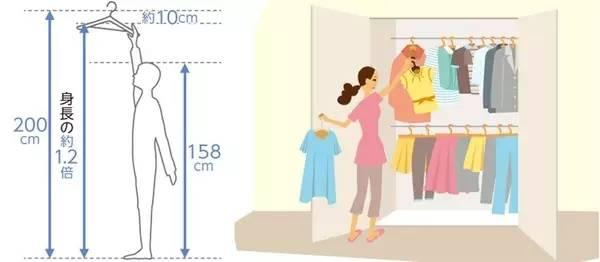 1)衣物的收纳中“悬挂”比“折叠”更便利上文中提到的困扰①的问题就在于折叠存放的衣物过多。在实际生活中我们很容易理解,在空间允许的情况下,悬挂设置的衣物不容易变形,容易取出,管理起来也更为方便。因此,尽可能的增加悬挂衣物的空间是设计衣柜的第一步,包括有效利用衣柜的高度分段设置晾衣杆。在伸长手臂能够刚好够着的高度设置一根晾衣杆,下方还能有空间再设置一根,充分利用垂直高度增加悬挂衣物的空间。一般来说,上部的晾衣杆通常设置在身高约1.2倍的高度上。
