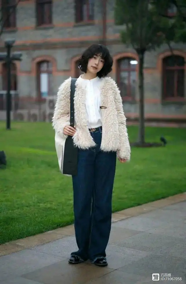 春天基础款单品确实有短毛绒外套的的一席之地,和短款小香风不同的是,大家在选它时,需要注意毛绒的长短。