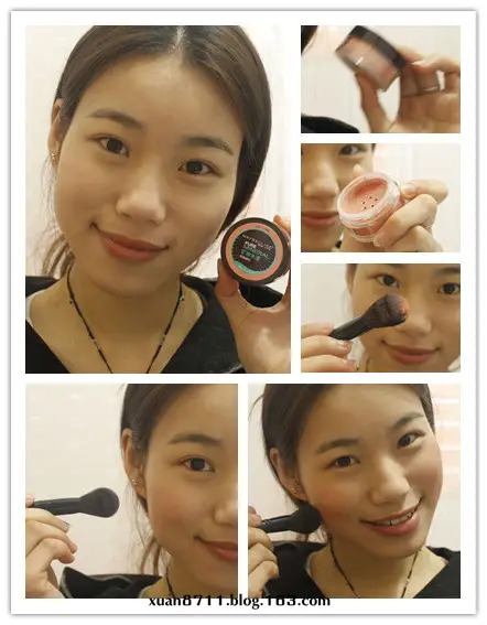 第三步:涂抹 以旋转打圈方式均匀涂抹于脸部,以完成无瑕贴合妆容,打腮红的时候一定要微笑哦