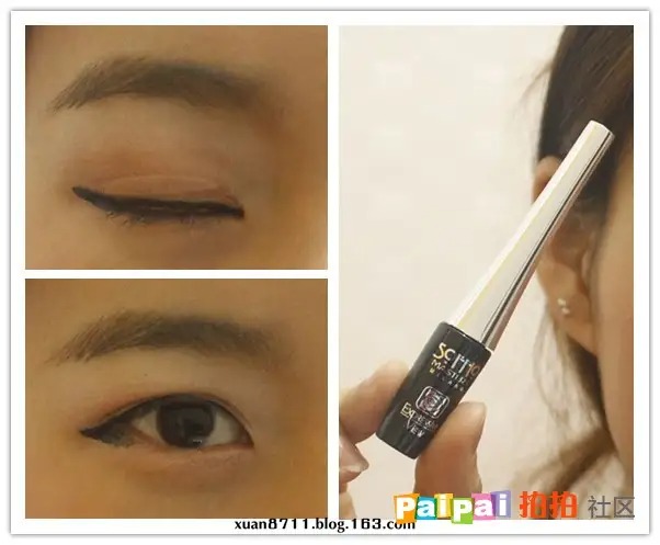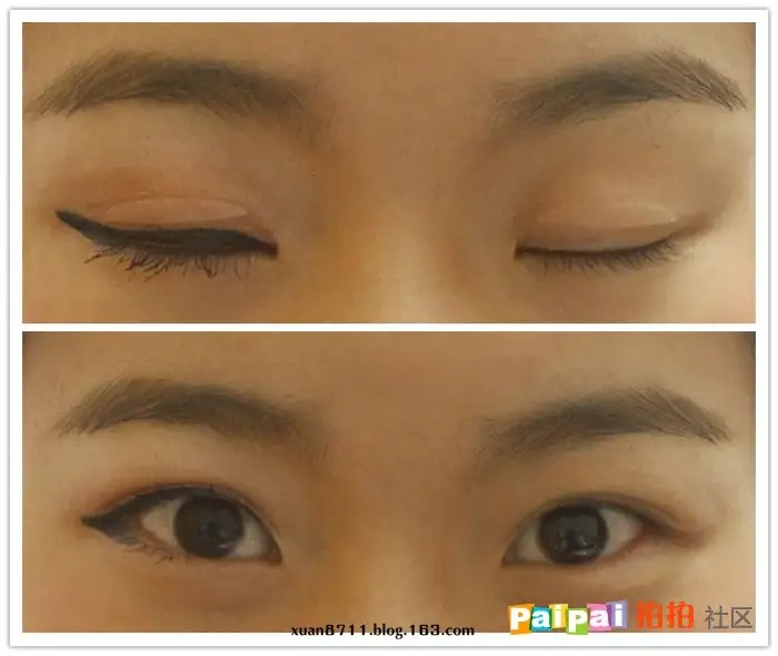 眼妆最重要的还是眼线。这款眼线液上色很快就干,不会脱妆,并且用温水就可以卸掉拉。眼线的画法就是沿着眼睛边沿画过,不能做到一笔画完,可以慢慢话的哈,只要不跑线,眼尾很重要,要收眼角,都涂黑掉哦。