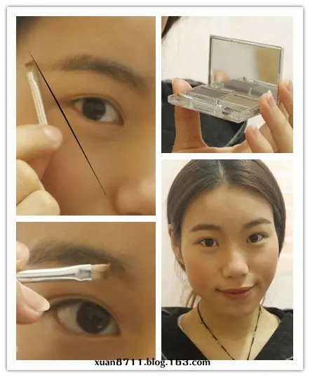 我用的是浅棕色的眉粉,就是因为我本来的眉毛很黑了。所以不能采用深色的,会更丑。眉粉上色很均匀自然。扫的时候注意:眉头、眉峰、眉尾。眉尾的位子就是图片上划线的3个点哦!