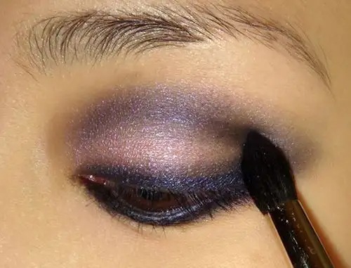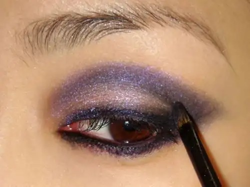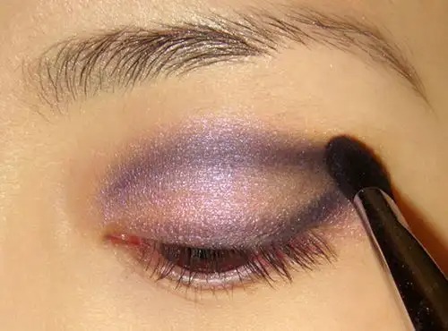 Step 3:用细密饱满的眼影刷粘取深蓝色眼影,描画出睫毛根部和眼睑的上缘,定义出你眼睑的轮廓。如果你是单眼皮,可以贴上双眼皮贴,深蓝的眼影沿双眼皮贴的边缘描画,以加深眼睛的深邃感。这时你会发现,闪粉色眼影和深蓝色眼影的混合,出现了奇妙的紫色效果。#p#副标题#e#