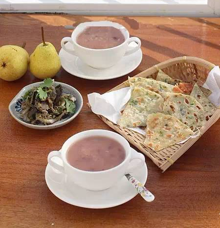 10、红豆大米粥,薄葱油饼,大头梨