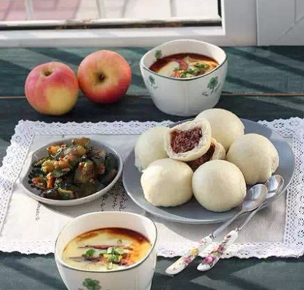 8、豆沙包,蒸鸡蛋羹,油黄瓜,苹果